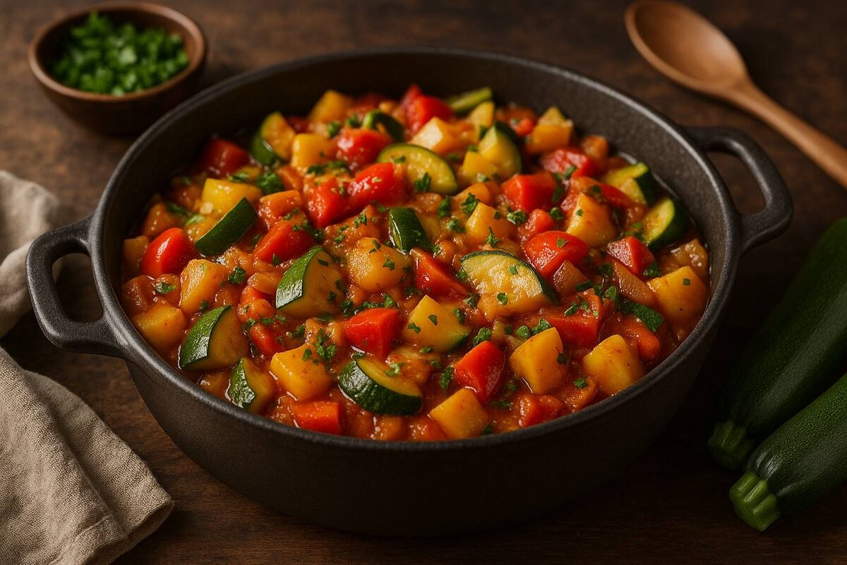 Это рагу обладает ярким вкусом и аппетитным ароматом, а благодаря множеству свежих ингредиентов является идеальным выбором для летнего ужина.