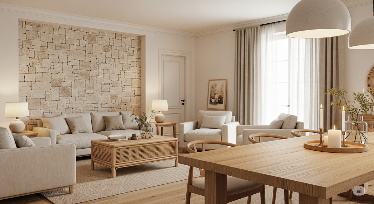 - Тёплая эстетика и уют: Материалы из природы создают атмосферу комфорта. Деревянные полы, хлопковое постельное бельё и глиняная посуда дарят ощущение уюта и тепла, в отличие от холодного пластика.