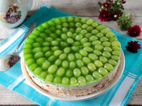 5. Подготовьте виноград: промойте, обсушите и разрежьте на половинки. Разложите виноград по застывшему желе, затем залейте оставшимся желе и оставьте в холодильнике на 2 часа для полного застывания. После этого аккуратно снимите форму с готового торта.