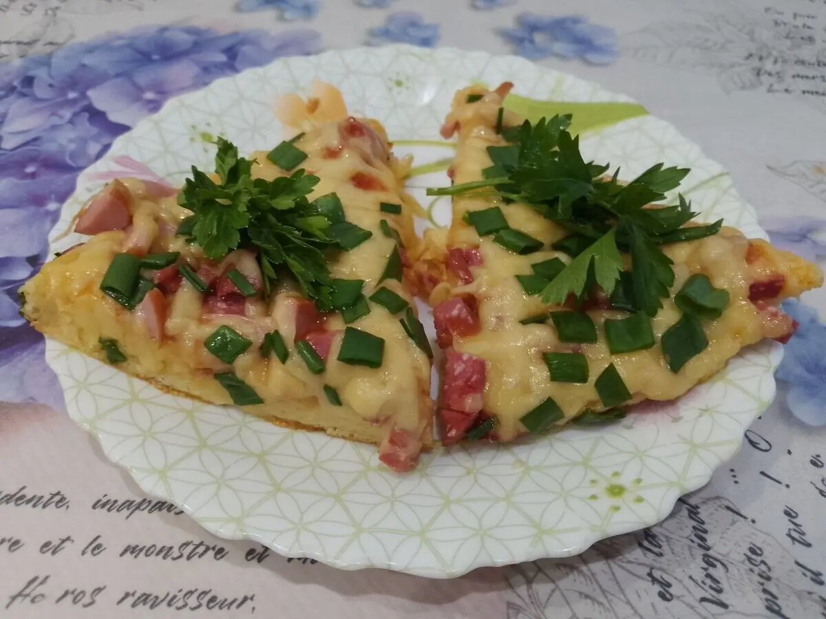 Сковорода смазывается жиром, и на неё выливается тесто. Затем по желанию его можно смазать кетчупом. Начинки добавляются слоями: сначала колбаса, затем тертый сыр и зелень. Накрываем сковороду крышкой и готовим на медленном огне около 15 минут, пока сыр не расплавится.