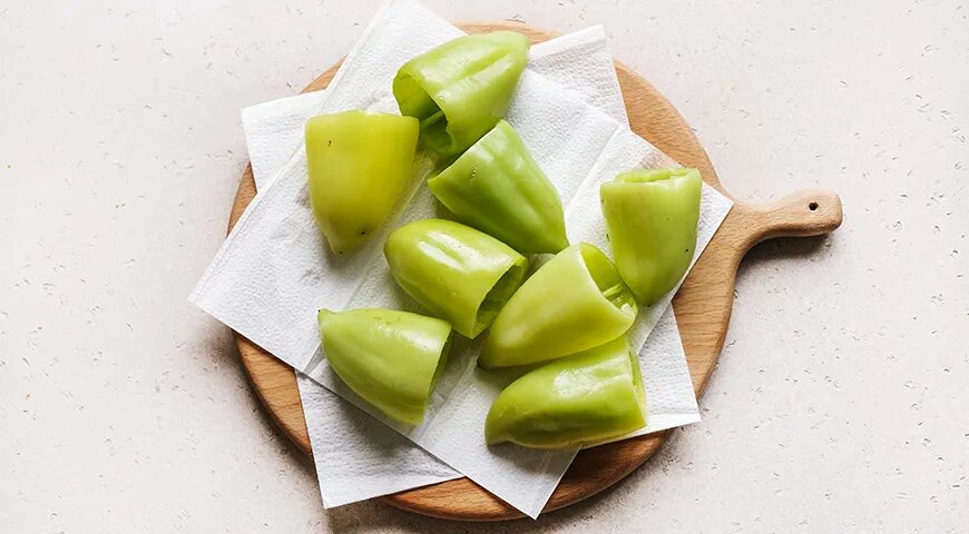 Для приготовления закуски на зиму, начините свежие и качественные перцы. Сначала необходимо тщательно вымыть овощи, аккуратно срезать верхушки с плодоножками и удалить семена. Затем в большой кастрюле доведите воду до кипения и погрузите в нее перцы на три минуты. С помощью шумовки вынимайте овощи, давая стечь воде, и ложите на бумажные салфетки, срезом вниз.