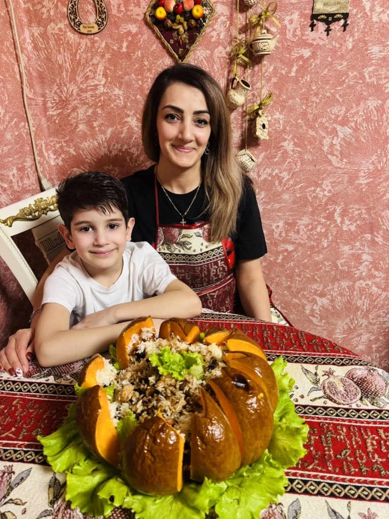 Хапама — это запеченная тыква, наполненная рисом и богатым набором вкусных ингредиентов. Внутри тыквы томятся рис с сухофруктами, орехами и медом, создавая сладковато-пряную начинку, которая придаёт этому блюду особое значение и праздничное настроение.