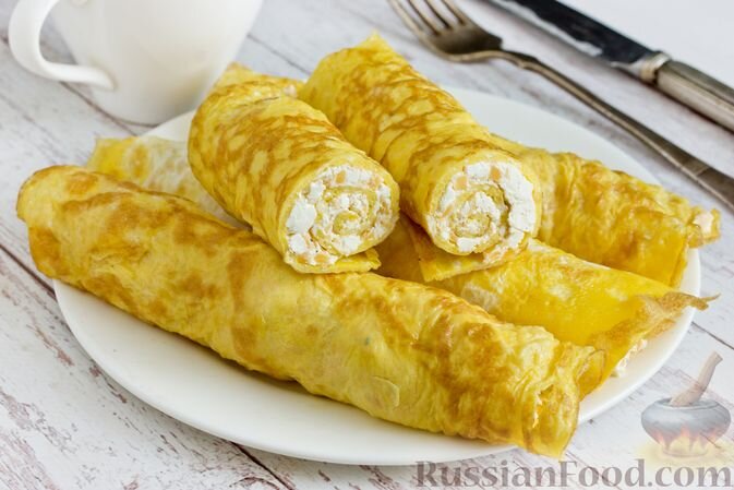 И, наконец, яркие яичные блинчики с творожной начинкой. Эти солнечные рулетики — сытный и вкусный способ начать утро, идеально сочетающийся с чашечкой утреннего кофе.