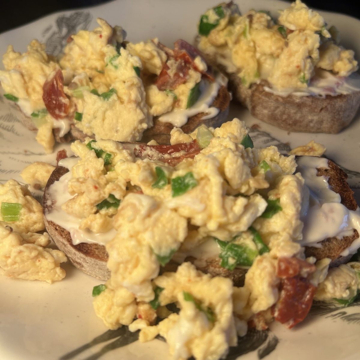 Брускетта с авокадо, болтуньей и беконом