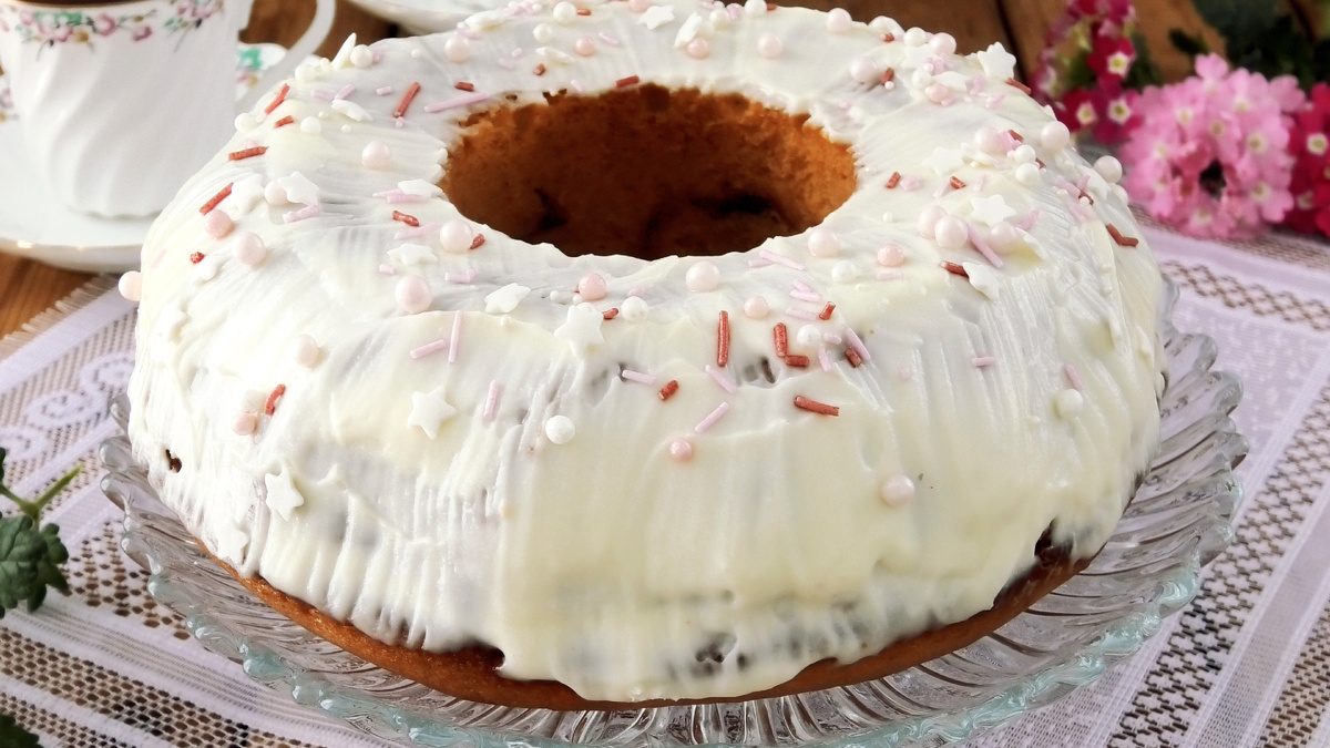 Для глазури смешайте творожный сливочный сыр с сахарной пудрой и частью молока. После достижения нужной консистенции, добавьте останок молока при необходимости. Остуженный кекс обильно смажьте глазурью и посыпьте по желанию.