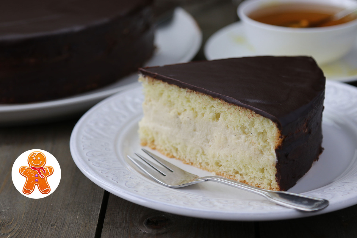 3. Пропитка и сборка: Сахар и воду доводят до кипения для получения сиропа, который, по желанию, можно дополнить коньяком. Сливки взбиваются с сахарной пудрой и аккуратно добавляются в заварной крем. На блюде укладывается первый корж, пропитывается, затем наносится крем. Второй корж также пропитывается и укладывается сверху. Для глазури растапливаются шоколад и масло до однородной массы и выливаются на торт. Дает застыть в холодильнике.