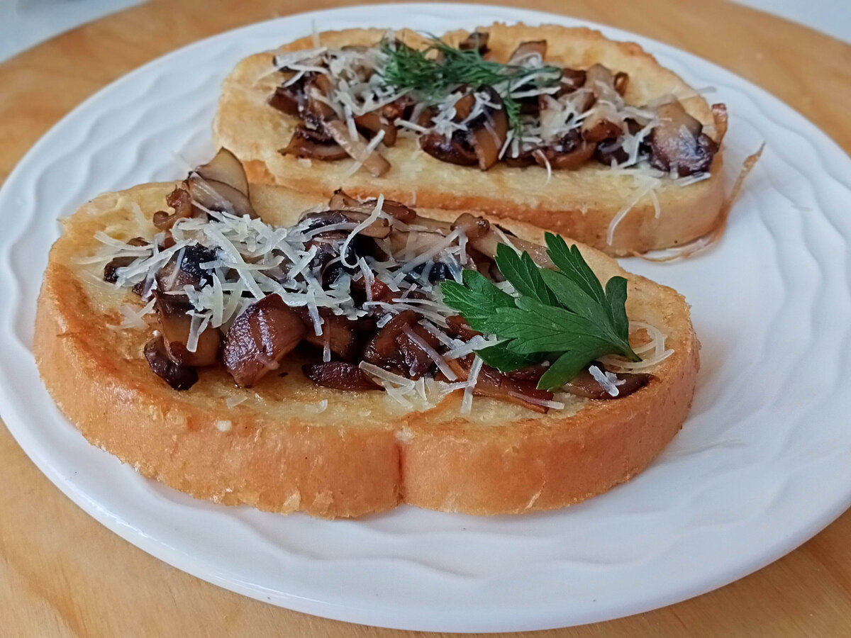 Когда хлеб будет готов, выложите его на тарелку. На каждый тост положите жареные грибы и щедро посыпьте тертым пармезаном.