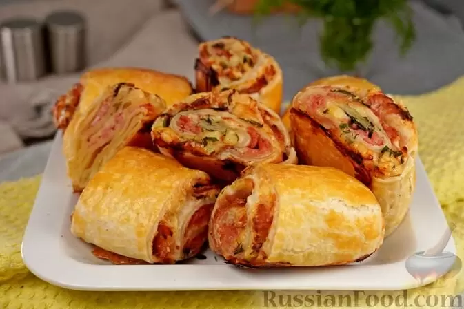 - Рулетики из слоеного теста с сыром и колбасой. Эти аппетитные закуски идеально подойдут для вечерин с друзьями. Что может быть проще, чем завести друзей за стол с румяными рулетиками, которые тают во рту и притягивают своим ароматом?