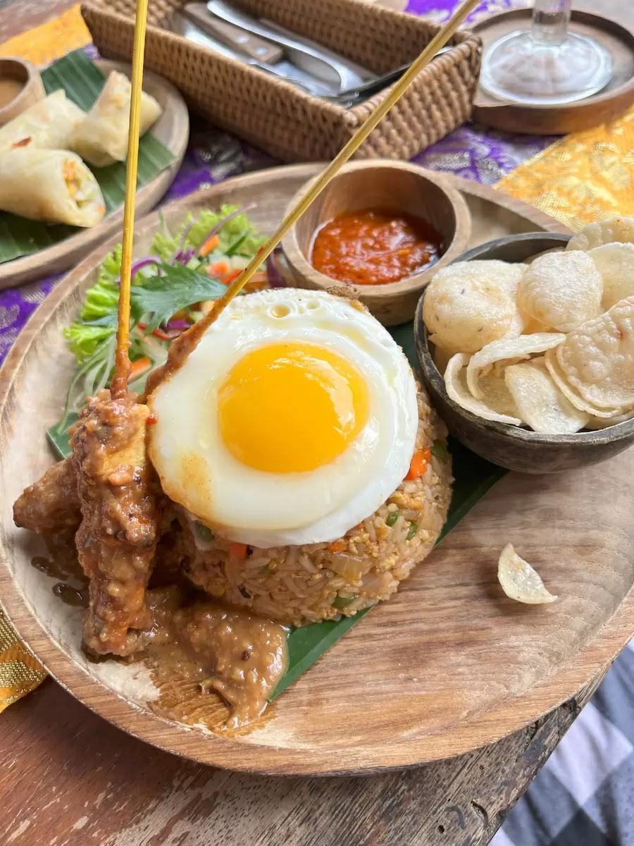 Nasi Campur — это еще одно блюдо, где рис выступает в роли основного ингредиента, но в отличие от nasi goreng, ингредиенты здесь подаются отдельно. К рису добавляют курицу, темпе, овощи и орехи, создавая визуальную симфонию на тарелке. В Убуде можно попробовать восхитительную версию этого блюда в том же ресторане Sun Sun Warung.