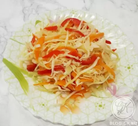 После этого салат следует выставить в холодильник минимум на два часа, чтобы овощи хорошо пропитались, и подать к столу.