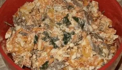 - К сердцу добавляют лук и морковь, хорошо перемешивают и тушат на медленном огне еще 3-4 минуты.