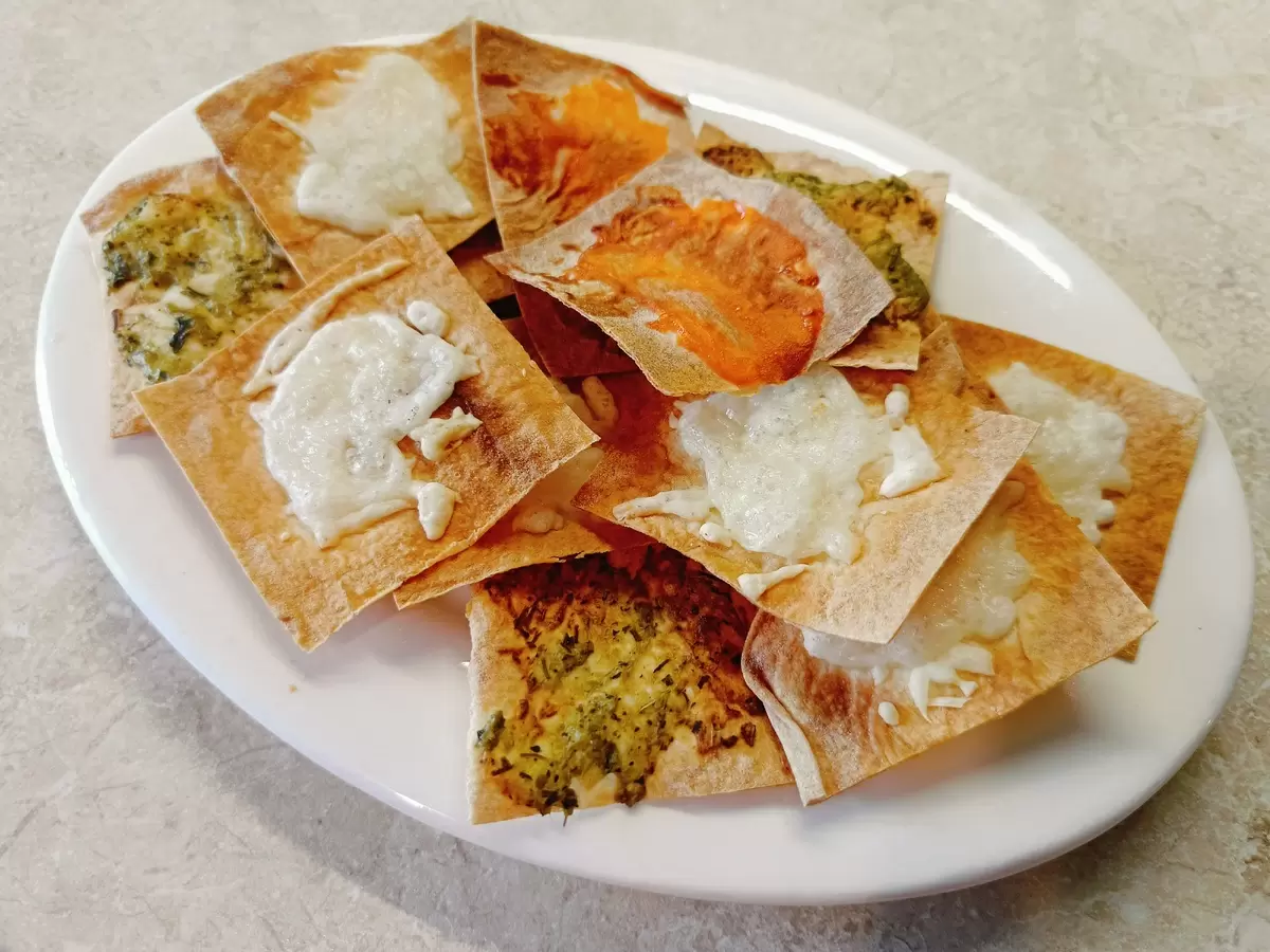 Первым шагом будет нарезка лаваша на небольшие кусочки: квадраты, ромбы или треугольники — на ваш выбор. Для лучшего вкуса каждый кусочек рекомендуется смазать начинкой, например, сыром, кетчупом или другим густым соусом. Можно также намазать растительным маслом и посыпать любимыми специями. Некоторые ломтики можно смазать песто для более интересного акцента.