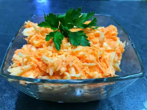 - В глубокой миске смешать натертую морковь с яблоком, а затем добавить ложку столового хрена для остроты. Всего лишь небольшая чайная ложка делает волшебство.
