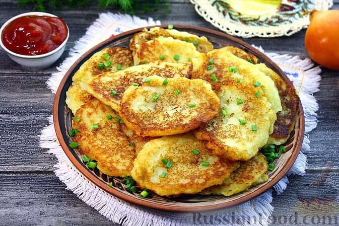 - Картофельные драники. Это простое в исполнении блюдо, основными ингредиентами которого являются тертый картофель и лук. С хрустящей корочкой и аппетитным золотистым цветом, драники подойдут для любого застолья.