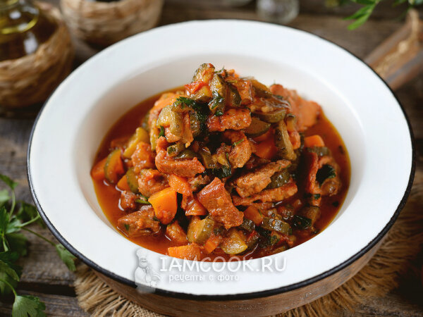 Тушеная свинина с солеными огурцами и томатами