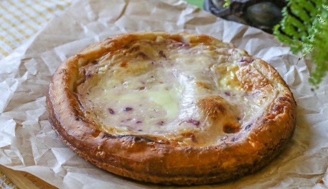 Когда тесто подойдет, равномерно налейте начинку на него. Для заливки смешайте сметану с яйцами и распределите полученную массу поверх начинки так, чтобы она её полностью покрывала.