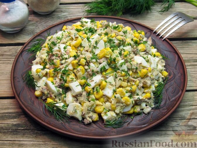 А если хотите, можно завершить день легким и сытным салатом из консервированной рыбы с кукурузой и яйцами, который приготовится всего за несколько минут.