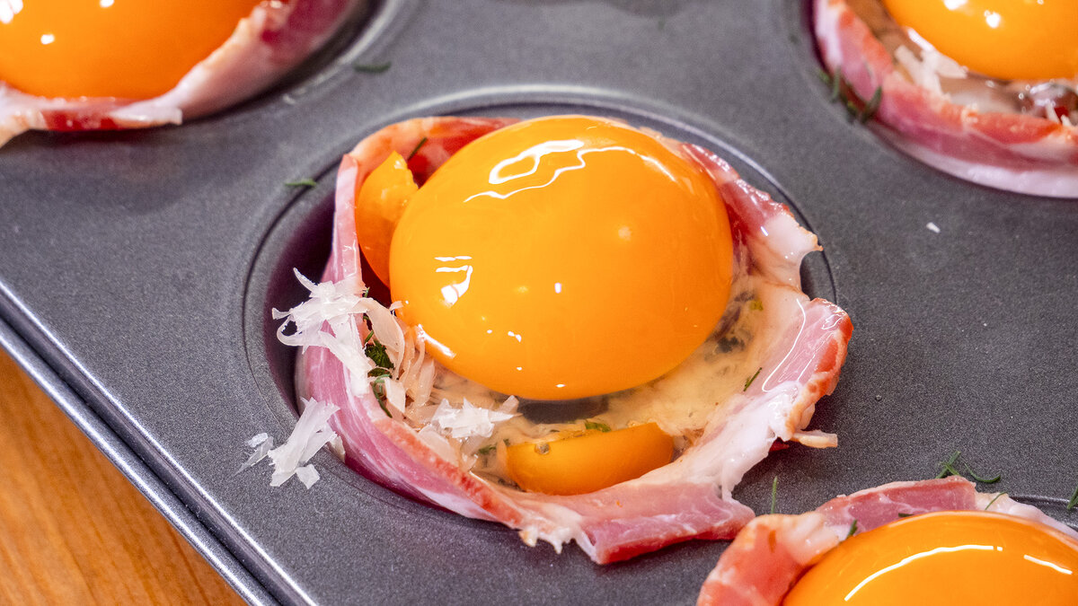Чтобы создать это гастрономическое произведение искусства, начните с подготовки формы для кексов. В каждую ячейку поместите по ломтику бекона, придавая ему форму гнезда. На дно добавьте небольшой кусочек бекона, чтобы гнёздышко было полностью заполнено.