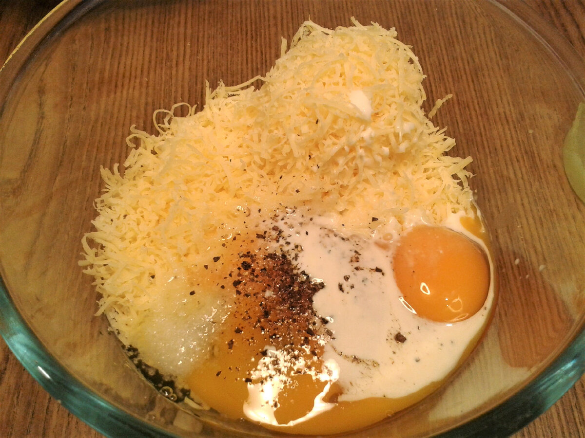 Затем можно приступить к приготовлению заливки: мелко нарезать шпинат, смешать его с яйцами, сливками, тертым сыром, солью и черным перцем. Все это тщательно перемешивается до однородной массы.