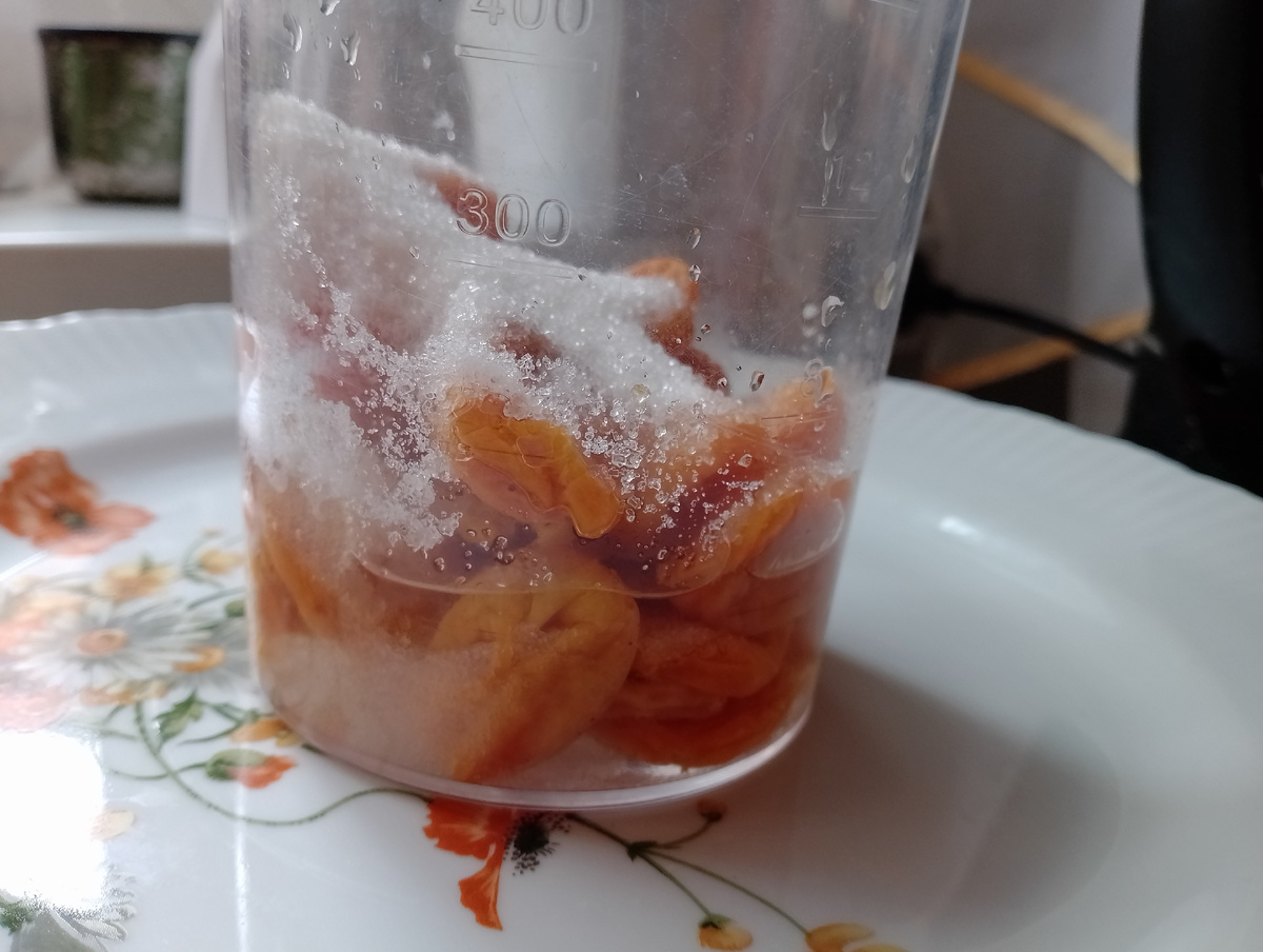 Курагу следует залить горячей водой и оставить на некоторое время. После этого тщательно промыть и измельчить в блендере, добавив немного воды и 2 ложки сахара для сладости. Начинка готова!
