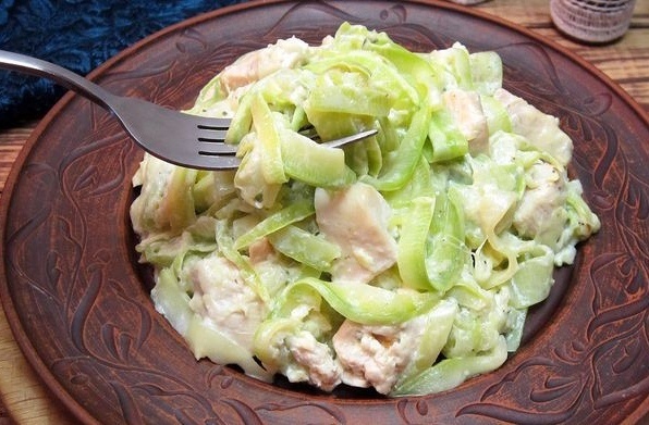 Перед началом готовки стоит подготовить все ингредиенты. Для удобства натертия плавленого сырка, его стоит поместить в морозильник на 20-30 минут. Кабачок нарезают тонкими полосками, что можно сделать с помощью специального устройства или терки для корейской моркови. Куриную грудку нарезают на небольшие кубики.