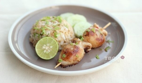 Не забудьте замочить шпажки в холодной воде на 15 минут — это защитит их от сгорания во время жарки. Затем, аккуратно нанизывайте маринованные кальмары на шпажки и готовьте на раскаленном масле примерно 1-1.5 минуты с каждой стороны до появления золотистой корочки.