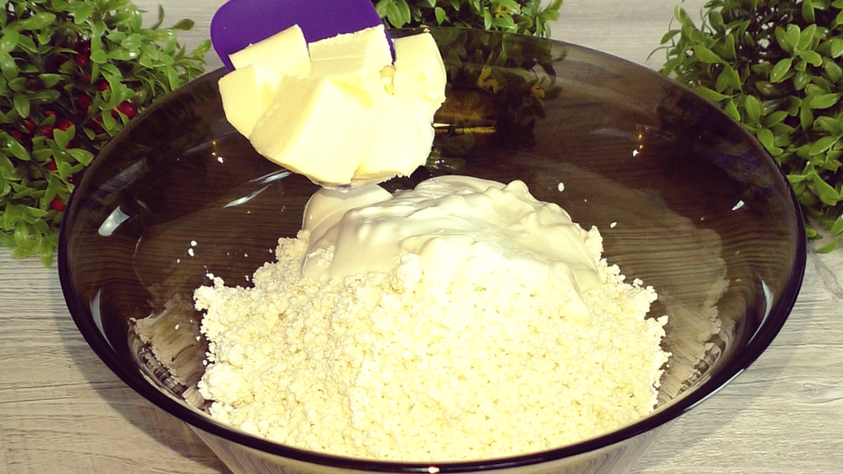 Для этого рецепта лучше взять творог 9%, а сметану — 20%. Сливочное масло необходимо заранее достать из холодильника, чтобы оно стало комнатной температуры.