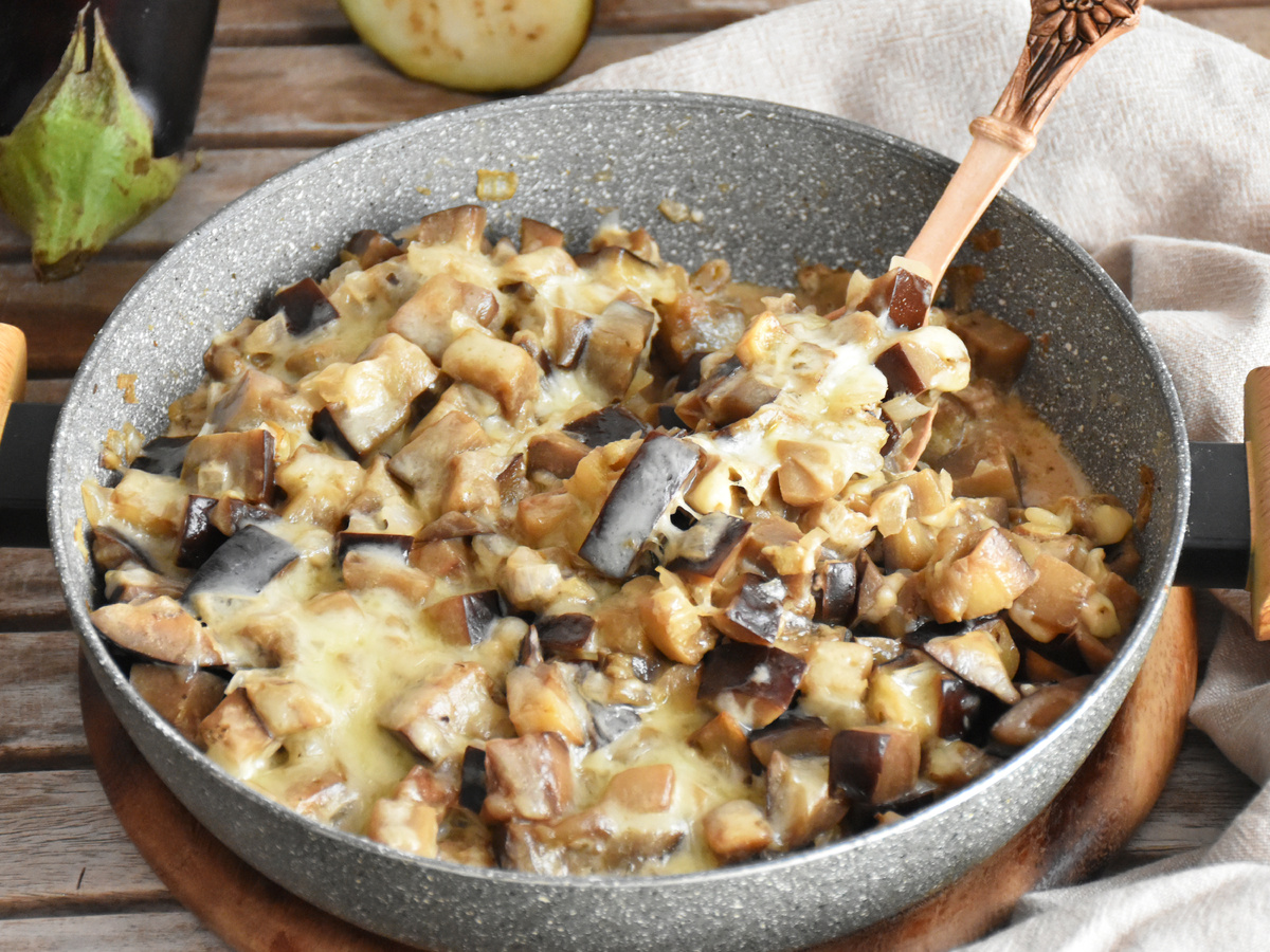 Бизначально необходимо подготовить баклажаны, нарезав их кубиками. Если они старые или слишком тёмные, рекомендуется посыпать их солью на 30 минут и затем промыть холодной водой. Это поможет избавиться от нежелательной горечи. Молодые плоды можно использовать сразу.