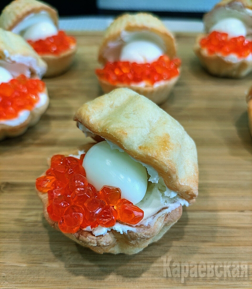Теперь пришло время наполнить каждую тарталетку кремом чиз. В шести тарталетках разместите по 1 перепелиное яйцо и немного красной икры. Соедините их под углом с остальными тарталетками, содержащими лишь крем. Такой необычный подход сделает блюдо не только вкусным, но и эстетически привлекательным!