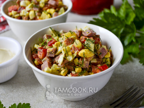 Салат, который завоюет сердца ваших гостей, сочетает в себе уникальные вкусовые оттенки. Представьте себе сладость ананаса, копченую нотку колбасы, хрустящий свежий болгарский перец и нежные вареные яйца. Ароматный укроп завершает эту картину свежестью и яркостью. Этот салат не только украсит праздничный стол, но станет любимым блюдом и в обычные дни.