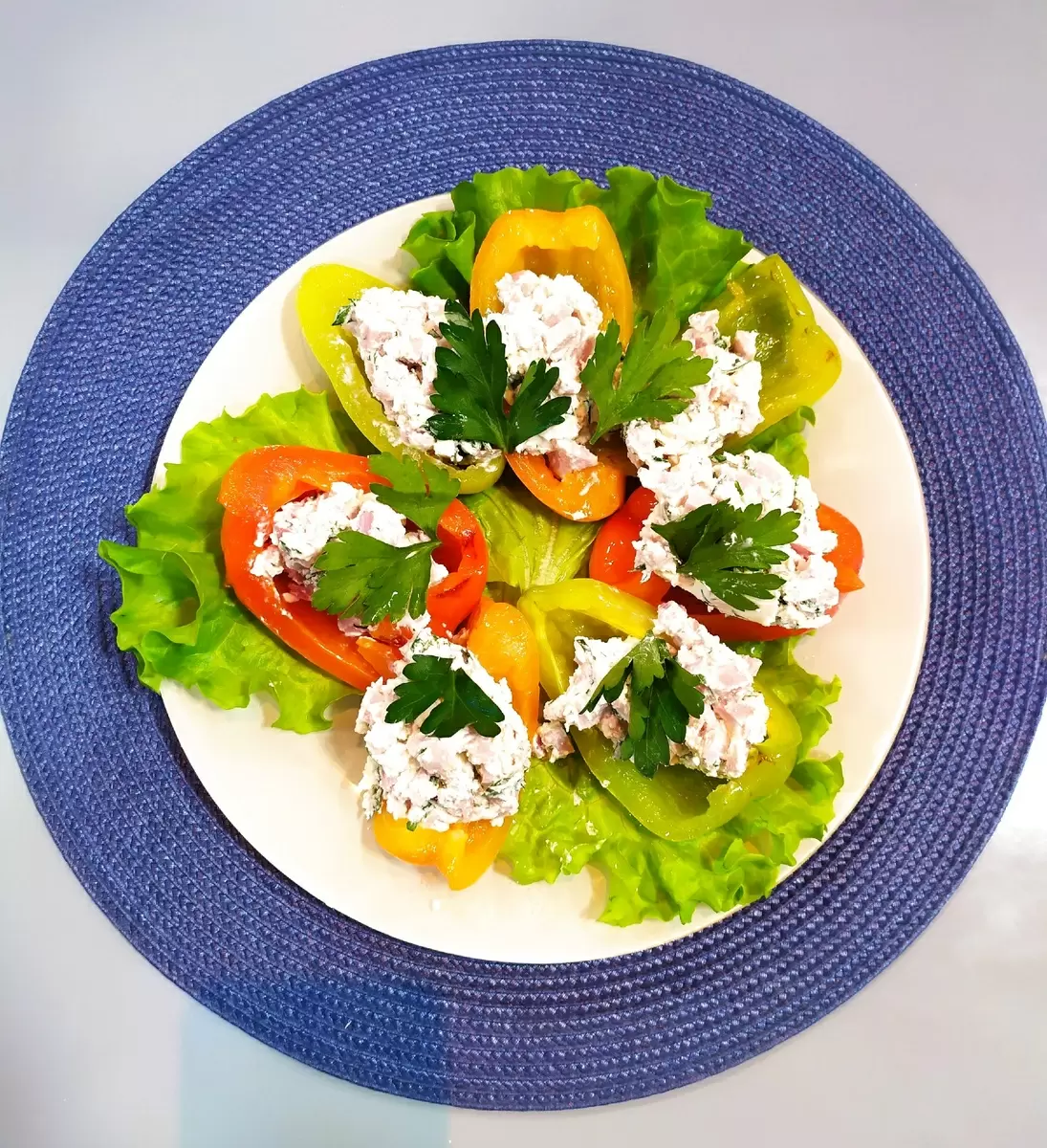 5. Заполните лодочки из перца сырно-ветчинной начинкой.