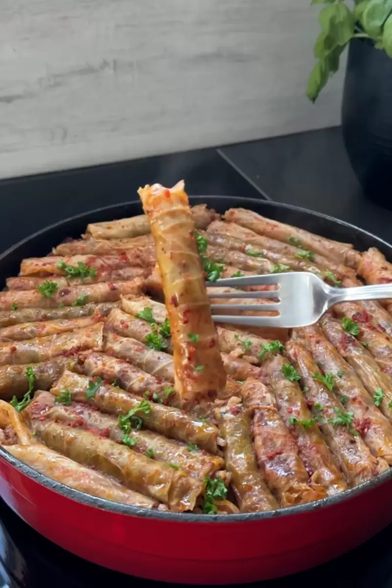 - Начинка: 500 г мясного фарша (говядина, баранина или их смесь), 1 стакан длиннозерного риса, 1 средняя луковица, мелко нарезанная, 2-3 зубчика чеснока, 2 ст. ложки томатной пасты, 2 ст. ложки оливкового масла, свежая зелень (петрушка, укроп, мята) — по вкусу, а также приправы: соль, перец, красный перец, сушеный тимьян и кориандр.