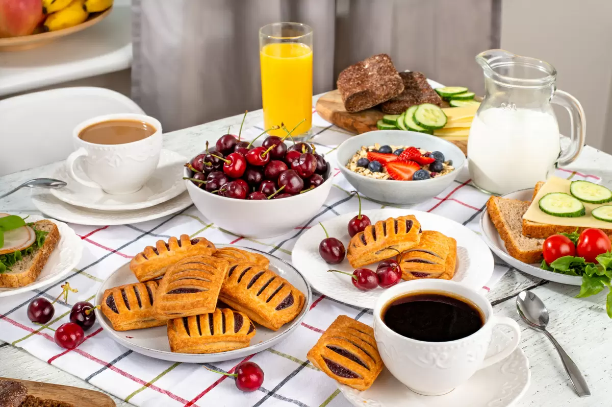 - Чай или кофе можно дополнить горячими круассанами — как классическими, так и с разнообразными начинками, включая шоколад и ветчину.
