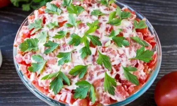 4. Добавьте ещё одну порцию майонеза. Помидоры нарежьте на средние кубики и аккуратно вмешайте их в салат, приправляя солью и перцем.