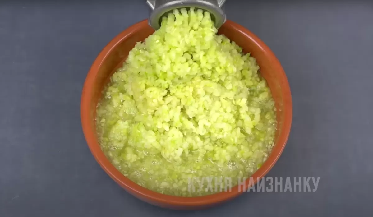 Первым делом кабачки следует тщательно вымыть и измельчить с помощью мясорубки. Если такой возможности нет, можно использовать мелкую терку. Затем с полученной массы необходимо слить лишний сок. Не отжимайте кабачки, достаточно просто убрать выделившуюся жидкость!