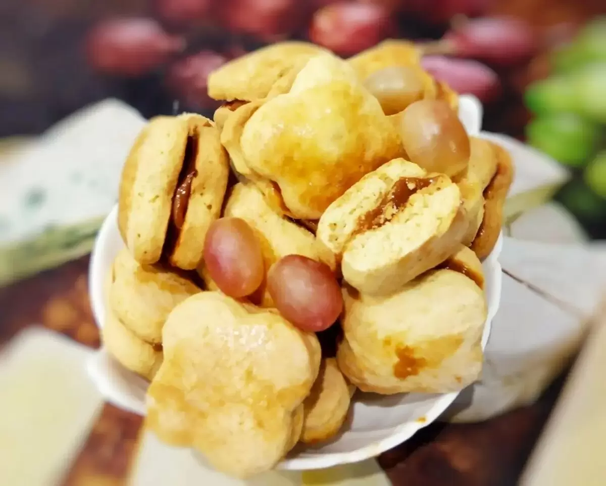 Теперь пышное песочное печенье с великолепной начинкой стоит на столе, готовое к чаепитию. Это идеальное угощение для семейных посиделок, а также замечательный способ порадовать близких сладостями собственного приготовления!