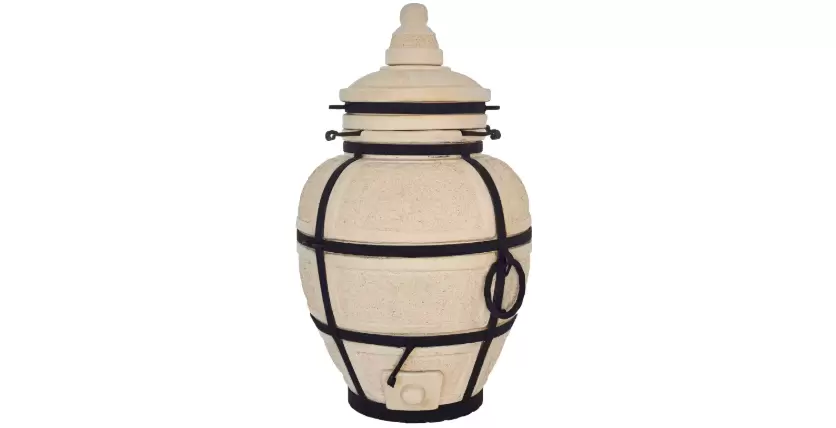 Открыв верхнюю крышку, пользователи смогут оценить внутреннее устройство печи. Внутри расположено восемь рифлёных шампуров с замысловатыми коваными элементами, идеально подходящих для мяса. Длина рабочей части шампура составляет 42 сантиметра. Нижняя крышка-поддувало удобно закрывается и фиксируется металлическим элементом. В набор также входят лопатка и кочерга для работы с углями и поддержания чистоты тандыра.