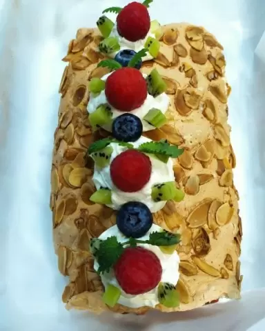 Для крема сливки взбиваются с сахаром и ванилью до получения пиков, после чего аккуратно вводится Маскарпоне. Корж смазывается кремом и посыпается ягодами, после чего его нужно аккуратно свернуть в рулет и украсить по желанию.
