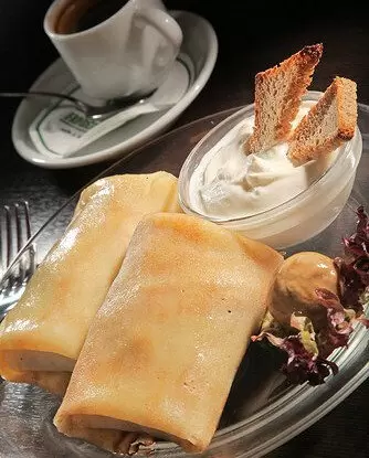 Приготовление блинов также не займет много времени. Перед подачей немного подогрейте их и выложите на две тарелки. В центр каждого блина добавьте ложку ароматного соуса и аккуратно сверните в рулет. Завершите, полив оставшимся соусом сверху.