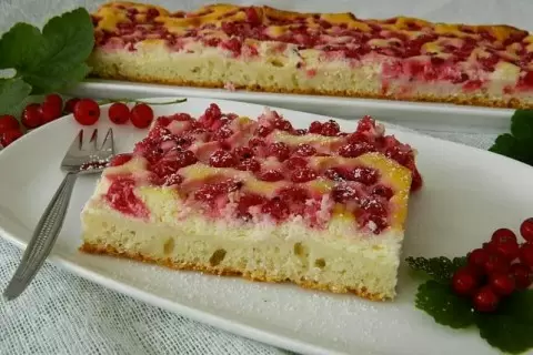 3. Творожную начинку аккуратно выкладывают на подготовленное тесто, сверху посыпают красной смородиной и отправляют в разогретую до 180 градусов духовку на 40-50 минут. Это создает потрясающий вкус, который станет изюминкой любого десертного стола.