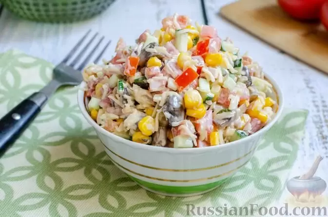 Овощной салат с колбасой, жареными шампиньонами и сыром станет прекрасным дополнением к любому столу. Сочетание свежих огурцов, мягких отварных яиц и ароматной копчёной курицы подарит отменный вкус. Этот слоёный салат отлично подойдёт для пиршеств и удивит всех своим великолепным оформлением.