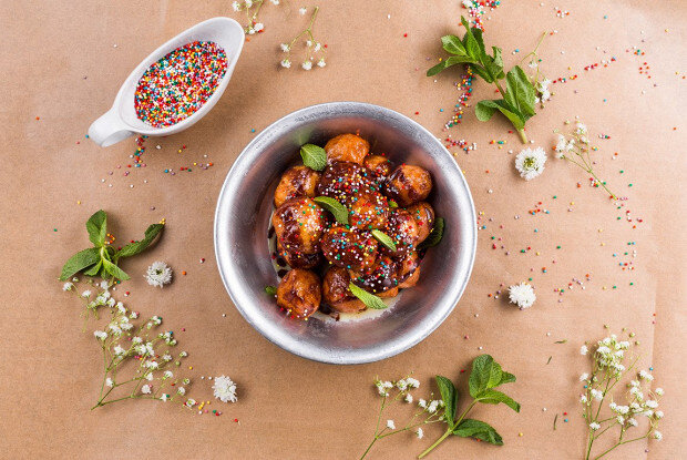 Для приготовления темного шоколадного соуса растопить 70 г черного шоколада в 100 мл молока, хорошо перемешать до однородной консистенции.Для белого шоколадного соуса растопить 150 г белого шоколада в 100 мл молока и тщательно перемешать.Готовые пончики аккуратно выложить на тарелку, полить белым и темным шоколадным соусом, украсить свежей мятой и кондитерскими украшениями. Приятного аппетита!